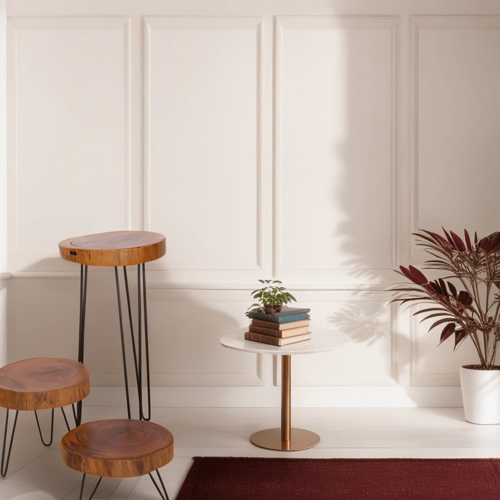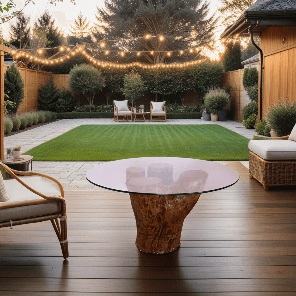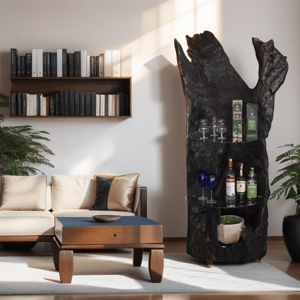 Cada peça preserva o formato original do tronco. Sustentabilidade autêntica: só usamos madeira de árvores que caíram naturalmente.